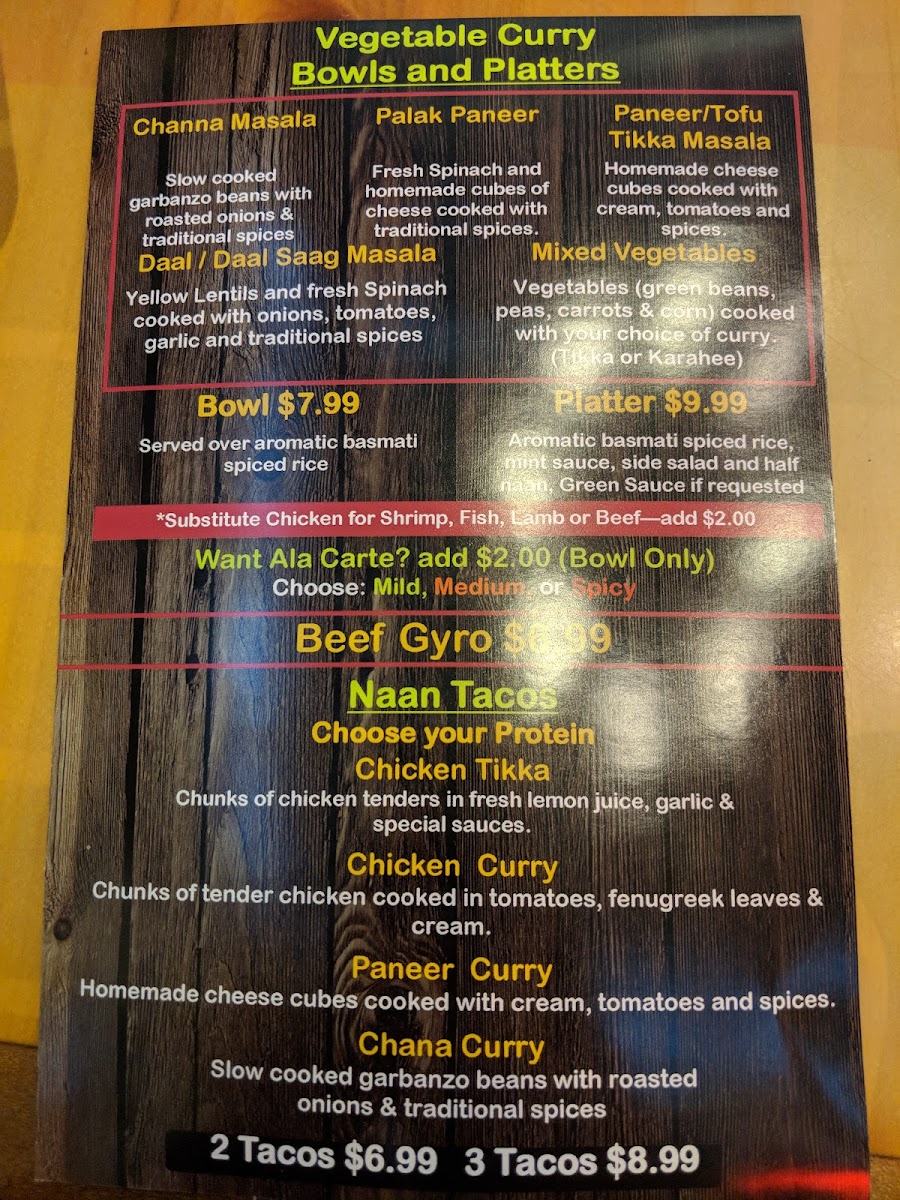 Vegetarians will find plenty to enjoy in the Vegetable Curry Bowls, with choices like Paneer Tikka Masala, Mixed Vegetable, Spinach & Cheese, and the Chana (Garbanzo Beans) bowl. These options are rich in flavor, perfect for anyone craving a vegetarian meal that doesn’t compromise on taste.